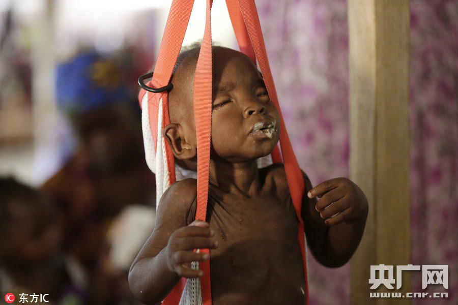 当地时间2016年8月29日,尼日利亚迈杜古里,一名营养不良的儿童在无边界医生的诊所里称体重。因有政府官员盗窃粮食援助,逃离博科圣地叛乱的儿童如今在尼日利亚最大城市的难民营里饿的奄奄一息。