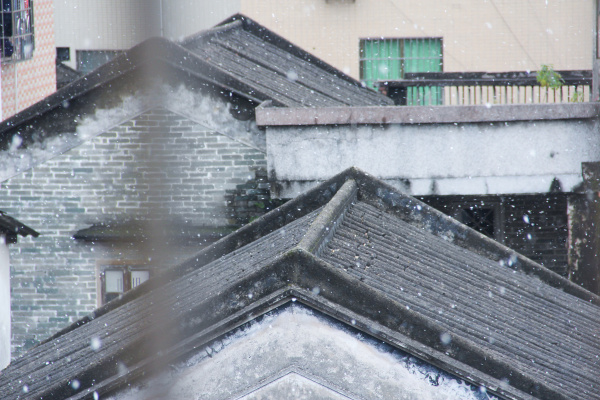 2016年01月24日,广东省广州市,番禺区蔡氏大宗祠。从23日晚上开始,广州市区开始剧烈降温,凌晨温度直逼冰点。24日早晨,广州各区县普遍飘起雪花,从未见过下雪的南方市民兴奋不已,纷纷拿起手机拍摄。谭丽佳