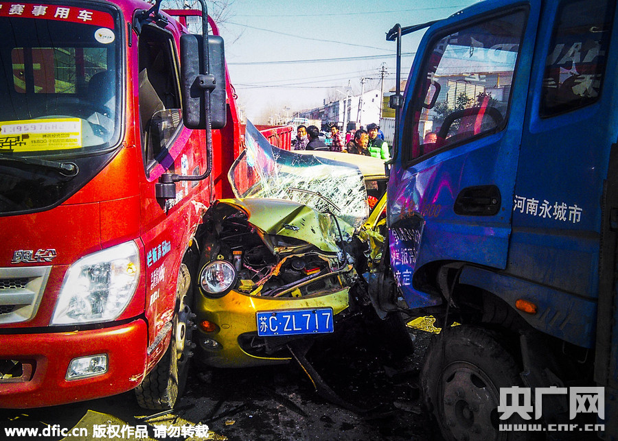 2016年1月25日12时许,安徽省宿州市,萧县祖楼镇311国道路面上,一辆河南籍车牌号为豫NQ0970蓝色货运汽车连续撞击迎面驶来的三辆机动车,造成其中一辆被撞的奇瑞QQ轿车面目全非,成为一堆烂铁。