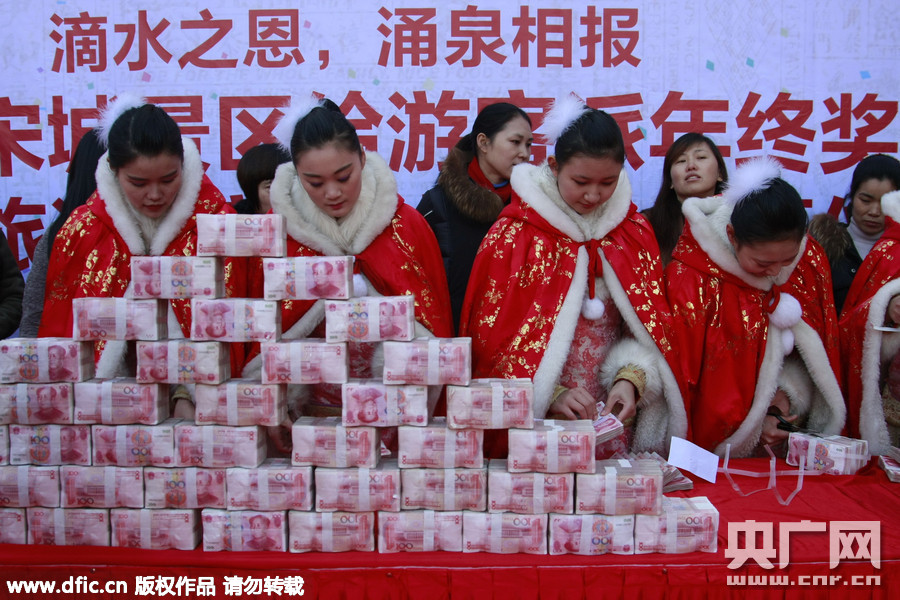 2016年1月26日,杭州宋城景区举行给游客派发年终奖活动。主办方通过微信征集了十位景区游客,在特定区域内限时一分钟,能抓多少带走多少。