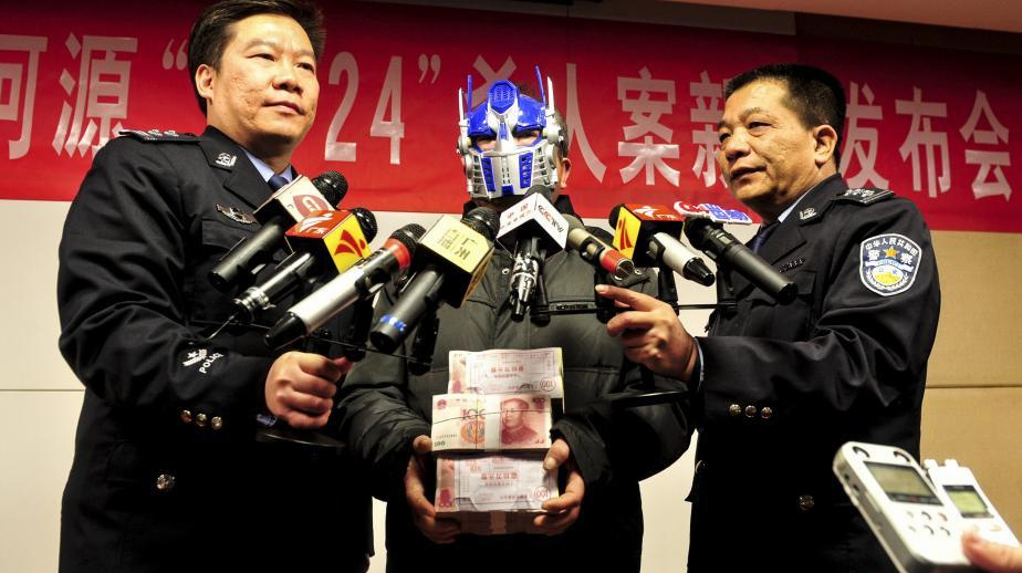 1月27日,广东省公安厅举行新闻发布会通报,广东警方历经94天的侦查,于26日在江西省瑞金市抓获公安部A级通缉犯刘纪平,成功侦破河源市“10·24”故意杀人案。27日凌晨,专案组连夜将刘纪平押解回广东。图为1月27日上午,广东省公安厅举行的新闻发布会上,举报人头戴变形金刚面具当场领走近年来广东警方通缉史上最高额悬赏金30万元。图片来源:中新网