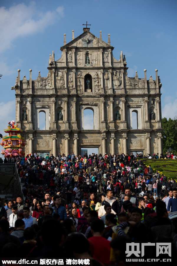 2016年2月9日,中国澳门,澳门蓝天白云、天气晴好,农历猴年春节黄金周假期,前来澳门旅游的各地游客络绎不绝,中外游客在澳门标示性景点,澳门大三巴牌坊、澳门议事亭前地、澳门手信一条街游览,人山人海,好不热闹。游客文明旅游素质较之前有所提高,乱丢垃圾现象有所改善,在富有浓重历史韵味与葡澳建筑特色的城区街道游走,感受这座东方赌城别样魅力。