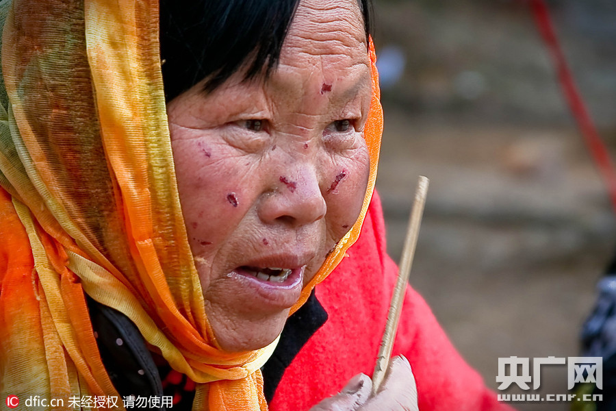 2016年3月1日,安徽省宿州市,萧县圣泉寺景区内20多个算命先生扎堆摆摊看相。图为一位妇女用利器把脸部戳烂冒充大仙招徕游客看相算命。吴克涛/东方IC
