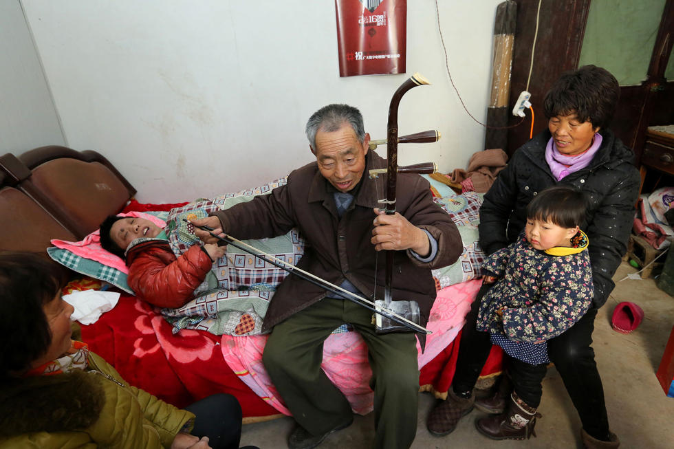 2016年02月29日,河南洛阳,在伊滨区佃庄镇黄庄村70岁的黄锁家里,他坐在妻子床前,拉起了《北京的金山上》这首曲子,来看望他妻子的邻居听得入了迷。25年前,妻子患病瘫痪在床,他每天为妻子拉二胡解闷。25年来,二胡换了两三把,他学会了200多首曲子。