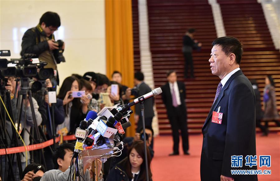 3月9日,十二届全国人大四次会议在北京人民大会堂举行第二次全体会议。这是会前,人力资源和社会保障部部长尹蔚民接受媒体记者采访。新华社记者 赵颖全 摄
