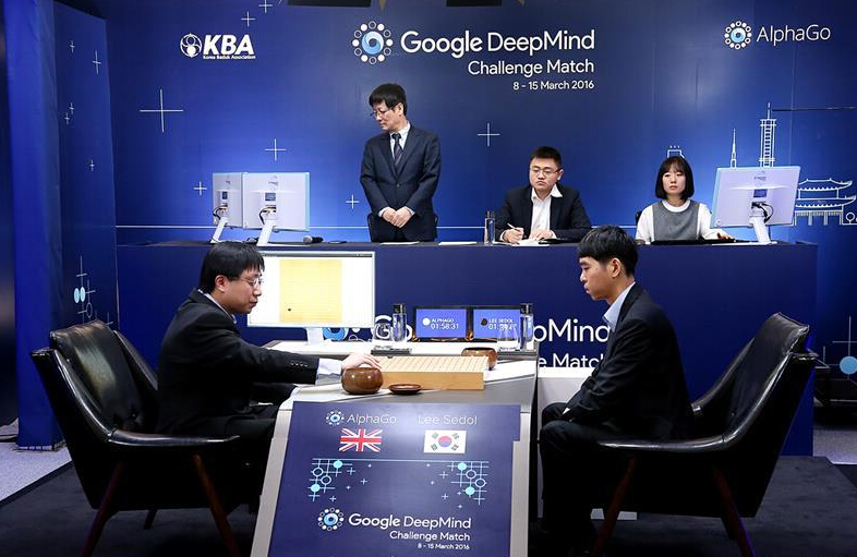 韩联社最新消息称,代表人类出战的李世石九段与谷歌DeepMind人工智能程序“阿尔法围棋”之间历史性的人机大战3月9日在首尔四季酒店拉开序幕。首局谷歌AlphaGo战胜李世石。图为3月9日,韩国九段棋手李世石(右)与“阿尔法围棋”对弈。 新华社发