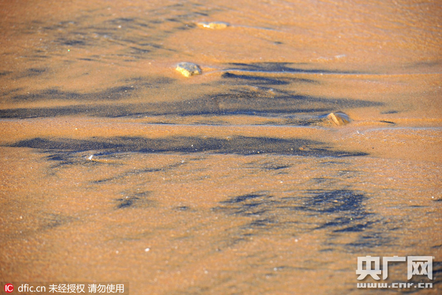 2016年3月23日,山东青岛银沙滩,潮水冲刷沙滩后留下不明的黑砂。