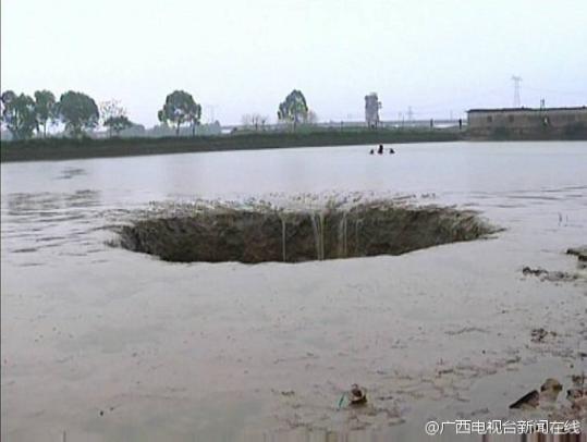 杨老板在广西桂平白沙镇石龙综合场第四大队养鱼,3月24日那天,他遭遇了一件怪事,当天凌晨四点左右,鱼塘的水位突然急剧下降,到上午九点,裸露的一处鱼塘底部惊现一个“天坑”,五万多斤鱼不翼而飞。村民推测这与附近的一个采石场有关。