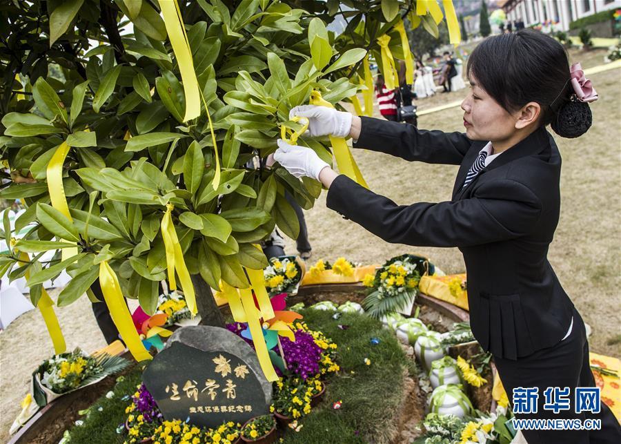 3月29日,安葬礼仪师在绿树上系上丝带祭奠逝者。当日,湖北武汉龙泉山孝恩园举行公益节地生态葬集体安葬仪式,共有27名逝者的骨灰回归自然。新华社记者 肖艺九 摄
