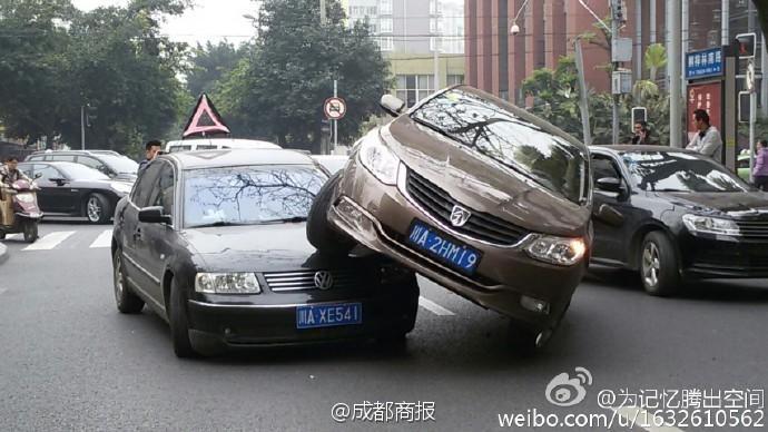 据网友爆料,29日下午在成都桐梓林南路发生一场奇葩车祸,司机下来后都笑了。网友称,交警来了,没有人员伤亡,车子也无大碍。
