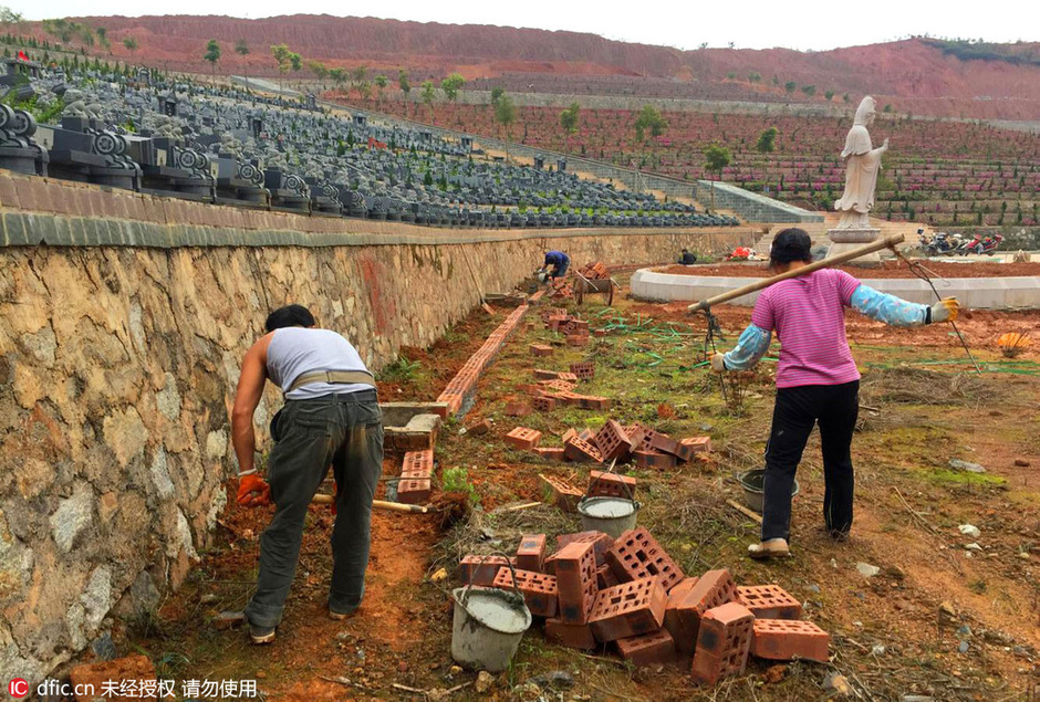 3月29日,广西壮族自治区梧州市,曾经被当地职能部门叫停的长青园公墓在未办理合法手续的情况下悄悄开工。图为工人正在现场施工。