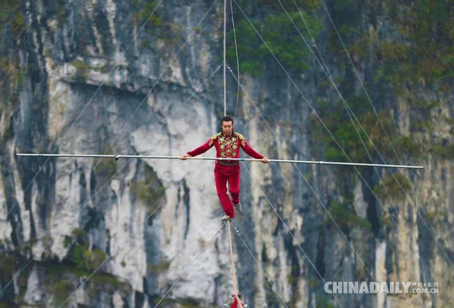 2016年3月30日,“奔跑吧钢丝侠武隆天坑高空飞人国际大赛”在重庆武隆世界自然遗产核心景区天生三硚的天坑顶部举行。来自中国的艾斯凯尔、瑞士的弗雷迪·诺克及来自意大利的扎瓦塔三大全球顶尖钢丝高手齐聚于此,进行走钢丝、跑钢丝的终极比拼,角逐最强者——“钢丝侠”的桂冠。图为新疆达瓦孜第六代传人艾斯凯尔在比赛中。