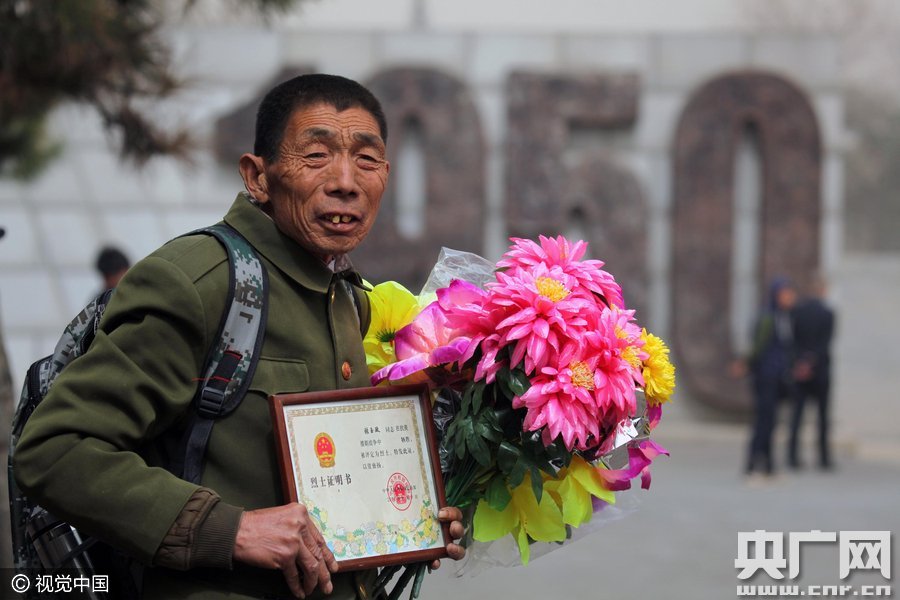 3月31日,66岁的张细海老人自费从河北平台乘16个小时火车,来到沈阳抗美援朝烈士陵园,迎接第三批在韩志愿军烈士遗骸回国。图片:视觉中国