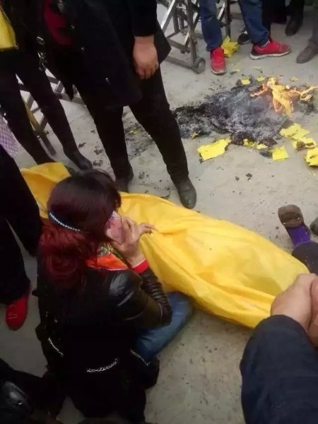 四川在线眉山频道讯 30日上午四川在线曾以《眉山东坡区多悦小学一住校女生死亡》为题报道,眉山市东坡区多悦小学六年级二班12岁女学生严某,被发现在学生住宿楼内不省人事,经送医确认死亡,31日下午17:59分,东坡公安通过官方微博发布案情。图为女生家长带着女生遗体在学校校门外烧纸。