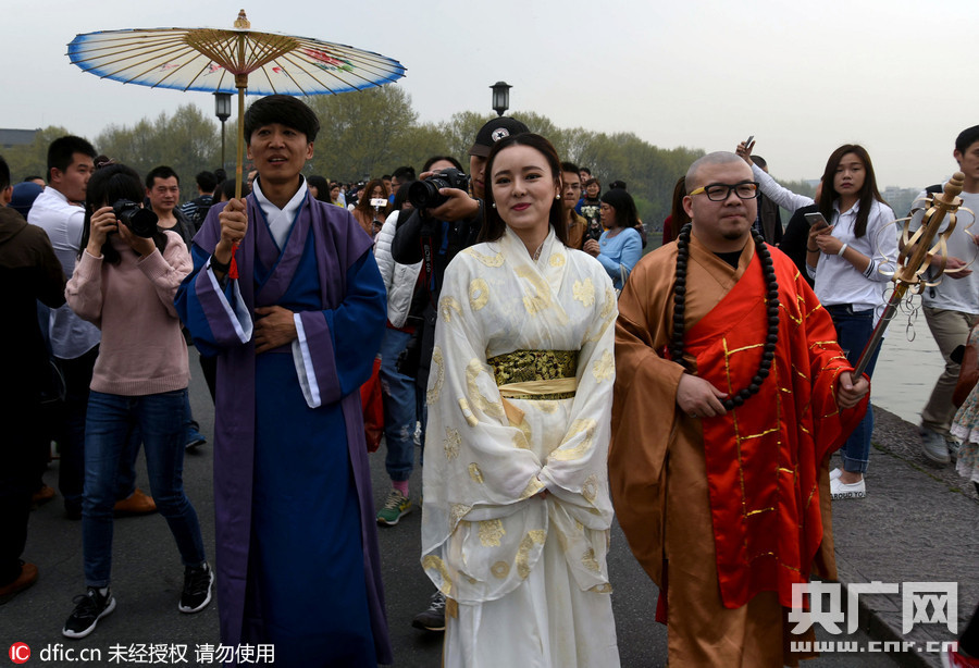 4月2日,浙江杭州,三名来自北京的游客化装为许仙、白娘子及法海现身杭州西湖白堤,再现《白蛇传》美丽传说,吸引众人纷纷驻足观看。施健学/东方IC