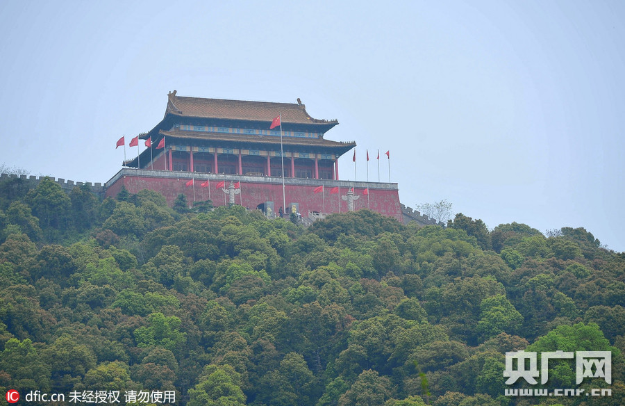 江苏省江阴市,华西村将全球各地的景观“搬”到自己村内。村内建有克隆的天安门、山海关、长城等中国古代建筑精华,又有法国凯旋门、美国国会大厦及悉尼歌剧院等国外“山寨景点”。其中,山寨“天安门”前方,还建了“金水桥”和“华表柱”。图为山寨版的“天安门城楼”屹立在山顶。
