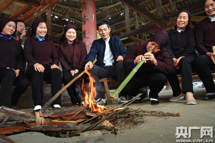 粟明英用竹筒吹风生火(央广网发 覃昆摄)