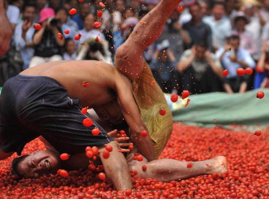 4月14日,在广西百色市田阳县敢壮山布洛陀文化遗址,欢庆布洛陀文化节的壮族民众在番茄池里举行摔跤比赛。4月12日至15日,2016年百色市布洛陀民俗文化旅游节在田阳县敢壮山举行。敢壮山壮族布洛陀文化遗址是壮民族始祖布洛陀文化的发祥地和祭祀地。蒋雪林摄