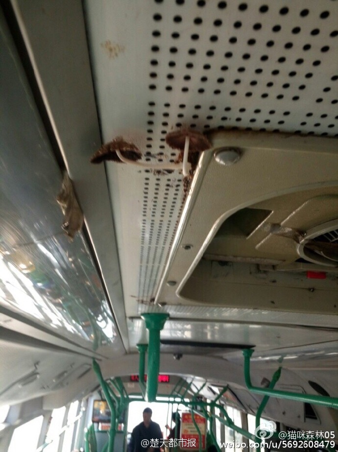 市民曹女士反映,她乘坐719路双层巴士时,在车厢座位底下也看见了成片的蘑菇,并戏称“公交车内养分充足”。市民王女士反映,4月21日早晨7时许,她在汉阳动物园乘坐一辆开往武昌的413路公交车,结果刚落座不久,就抬头发现在车厢顶部长着几颗灰顶白茎的大蘑菇,她随即拿出手机将其拍下,并发到网上。