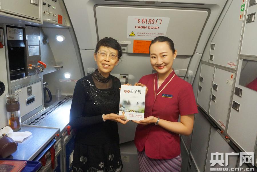 图为4月23日,南航三亚-长春CZ6629航班,南航工作人员将国学典籍赠予幸运旅客。(楚洪雨 摄)