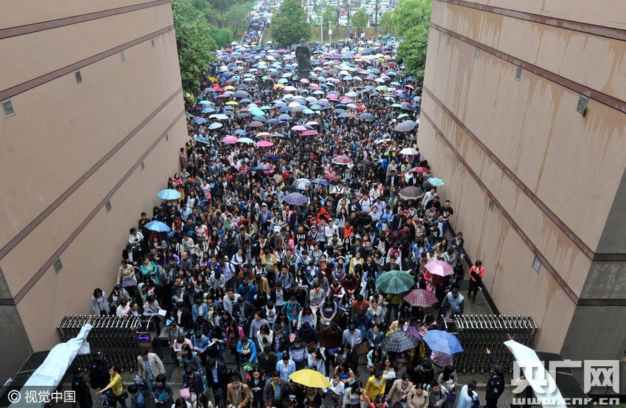 2016年4月23日,湖北省武汉市中南财经政法大学考点,考生冒雨参加笔试,雨中伞花蔚为壮观。湖北省2016年度公务员参考总人数为115831人,创历史新高。吴铭/视觉中国