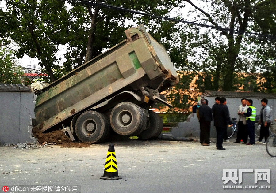 2016年4月24日,在北京石景山区京源路327公交车河堤站东侧,一辆工程汽车不知何故,一头扎进北京燕山水泥厂宿舍围墙,庆幸无人员上亡,因该路段路窄车多,造成社会大量车流缓慢行驶。建议驾驶人员上路注意交通安全。