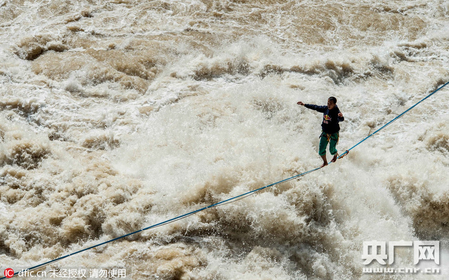 张亮在扁带上行走,准备横跨虎跳峡。