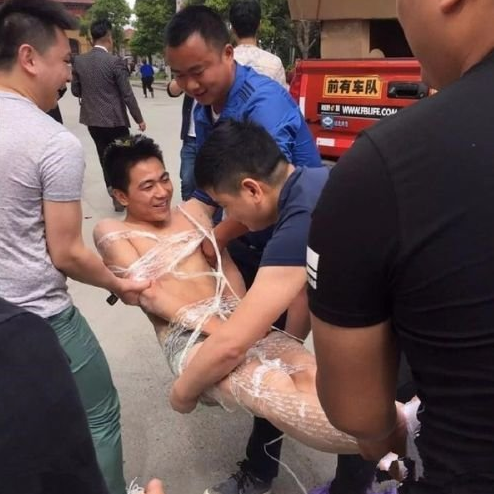 日前,有网友爆料,陕西安康某地的婚俗,新郎被扒光绑在树上,被泼狗血,亲友还拿灭火器喷新浪。对此,有网友称:“这个新浪太惨了,我宁愿单身到老”。图为新浪被人捆绑起来抬走。