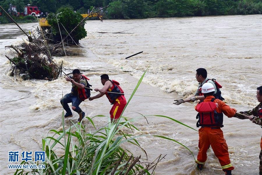 5月5日凌晨,广西桂林市龙胜县瓢里镇,一辆吊车和一辆装满桂花树苗的农用车被困在桥上,车上6人被洪水围困。凌晨3时40分,消防官兵到达现场,此时现场一片漆黑,只能听到哗哗的湍急河水声,消防官兵通过强光照明灯具观察到,河中央共有1辆农用车和1辆吊车被洪水围困,车上共6人被困,河水不断上涨,情况十分危急。