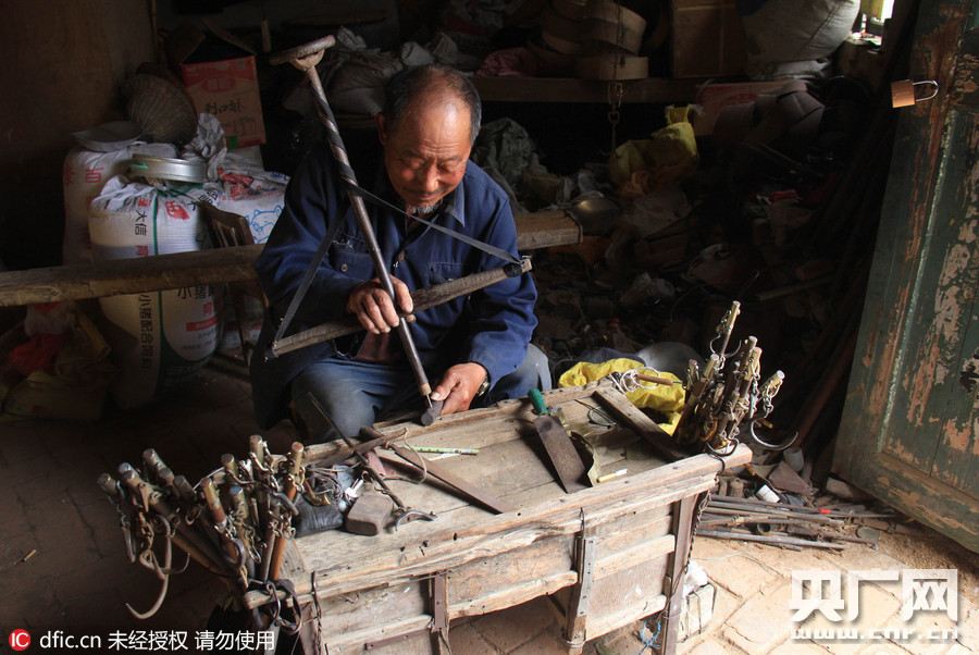 2016年5月7日,江苏连云港,连云港市赣榆区金山镇谭湖村制秤人韦有言在家里给杆秤打孔。今年80岁的连云港市赣榆区厉庄镇谭湖村韦有言老人,祖宗三代以修秤为业。13岁跟着父亲学习制秤手艺,17岁就自立门户挑着担子赶集卖秤。60多年,他制作了20万多杆秤,是赣榆颇有名气的制秤手艺人。