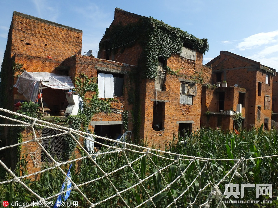 2016年6月23日,湖北宜昌市猇亭区,三国古战场旅游景区背后的山岗上,7栋烂尾别墅一字排开;来自重庆等地的数位农民工将这些烂尾别墅简单地收拾后蜗居在其内,省去了租房。据了解,这些烂尾别墅为独立单栋3层复式建筑,已经荒废10多年,也无人管理。