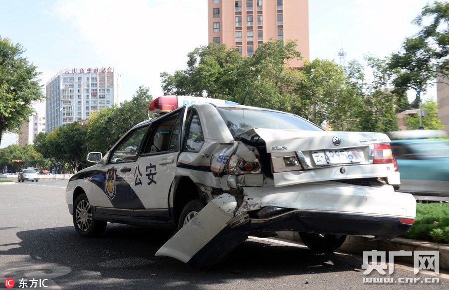 2016年08月12日清晨7时40分时,昆明市环城西路与气象路交叉口,一辆宝马车突然撞向两辆停在路边的巡逻警车,又冲上绿化带撞倒监控杆,最后撞上行道树才停了下来。所幸,没有造成人员伤亡。据目击者说,宝马车的驾驶员是一名女子,安全气囊都弹了出来。事发后,五六名警察冲上去将女子带下车来,女子下车后全身瘫软,后被民警带走。图为被撞警车。