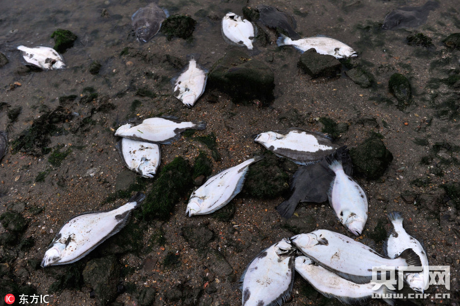 2016年8月14日傍晚时分,随潮水的退去,山东青岛顾家岛渔港码头岸边出现许多死去的牙鲆鱼和漂浮在海水上面的黑头鱼。据养殖渔民介绍,由于近日的持续高温,海水温度达到31摄氏度,在网箱里养殖的部分在上层的牙鲆鱼和黑头鱼被热死。养殖渔民将死鱼捞出后抛入海中,沉入海底和漂浮在海面的死鱼随潮水被带到岸边,潮水退去后被遗留在岸边沙滩上。图为现场。