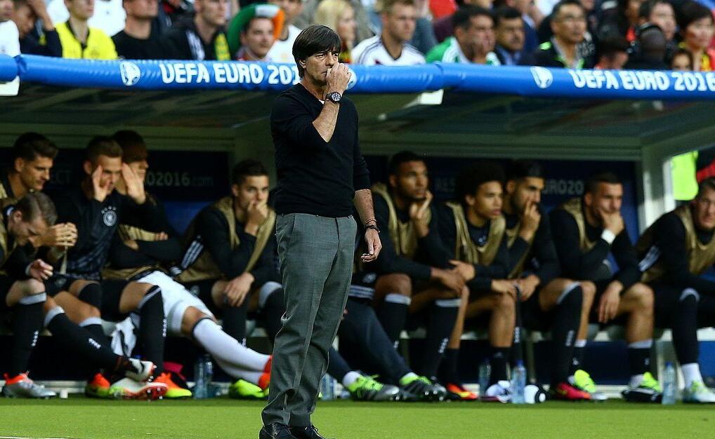 当地时间2016年6月16日,法国巴黎,2016法国欧洲杯小组赛C组,德国0-0闷平波兰,德国队主教练勒夫场边焦急指挥比赛时不由自主的扣起了鼻子。