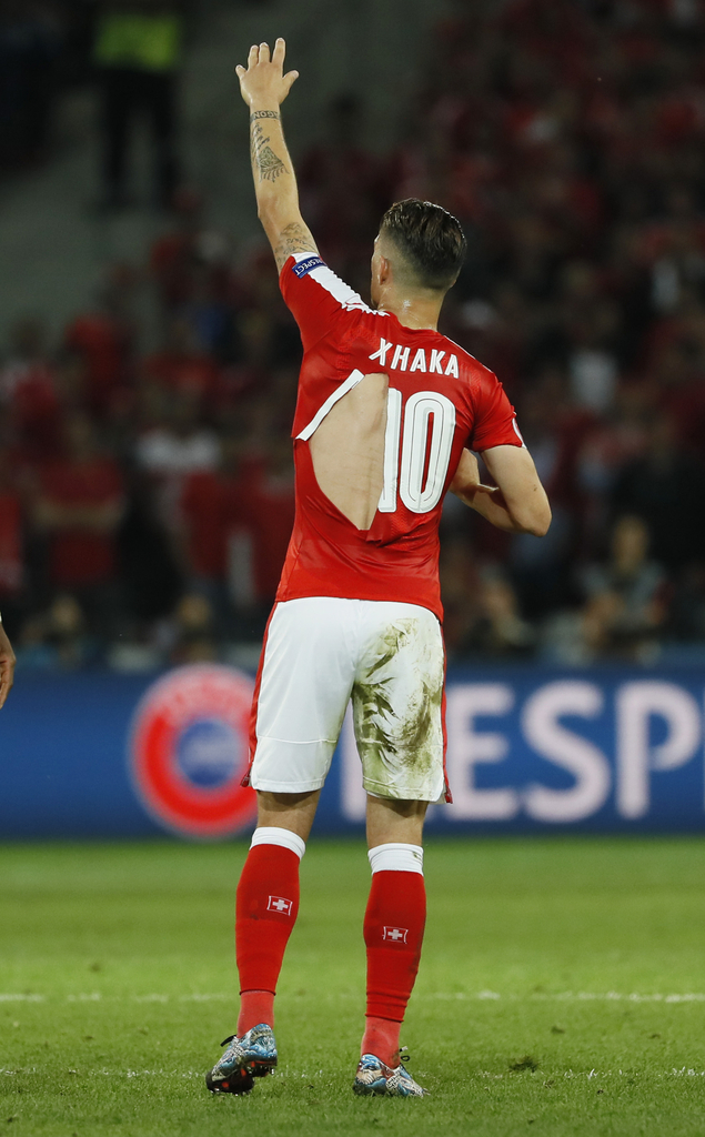 2016年6月20日,法国里尔,2016欧洲杯小组赛A组第3轮,瑞士Vs法国。瑞士队扎卡、默罕穆迪、恩博洛球衣被扯坏。