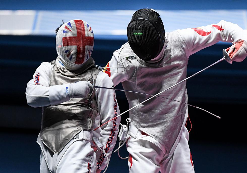 8月12日,中国队选手雷声(右)与英国选手梅普斯特德在比赛中。当日,在2016年里约奥运会男子花剑团体赛中,中国队以45比38战胜英国队,获得第五名。
