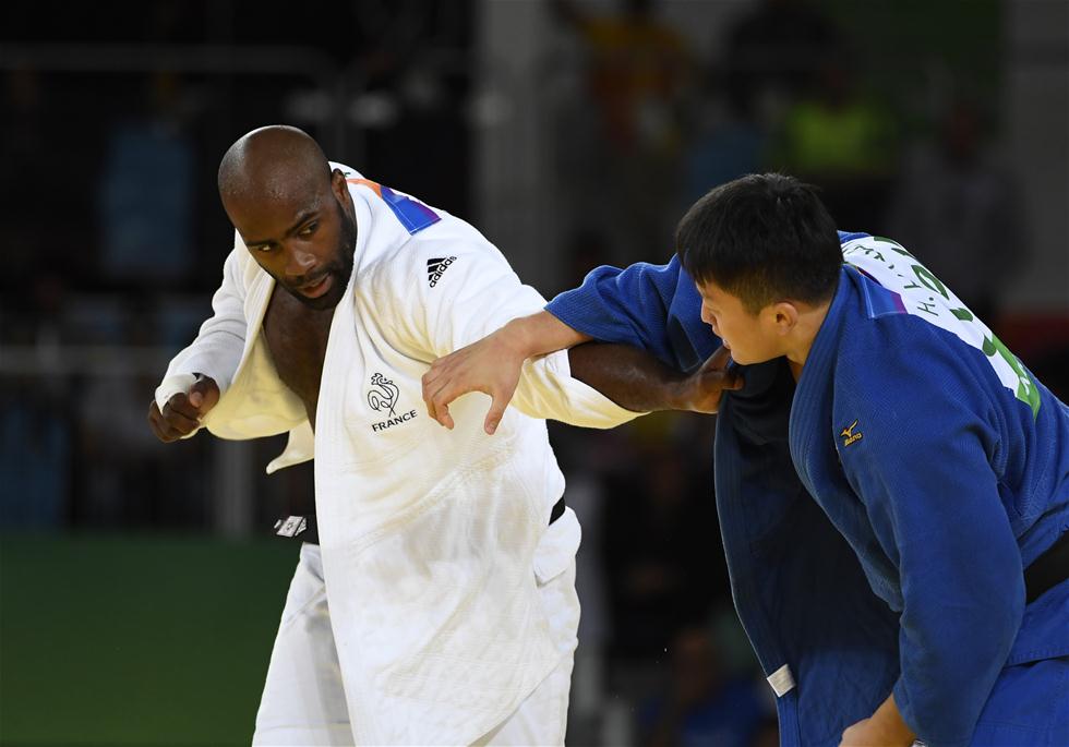 8月12日,法国选手里内(左)和日本选手原泽久喜在比赛中。当日,在2016年里约奥运会柔道男子100公斤以上级决赛中,法国选手里内战胜日本选手原泽久喜,获得冠军。