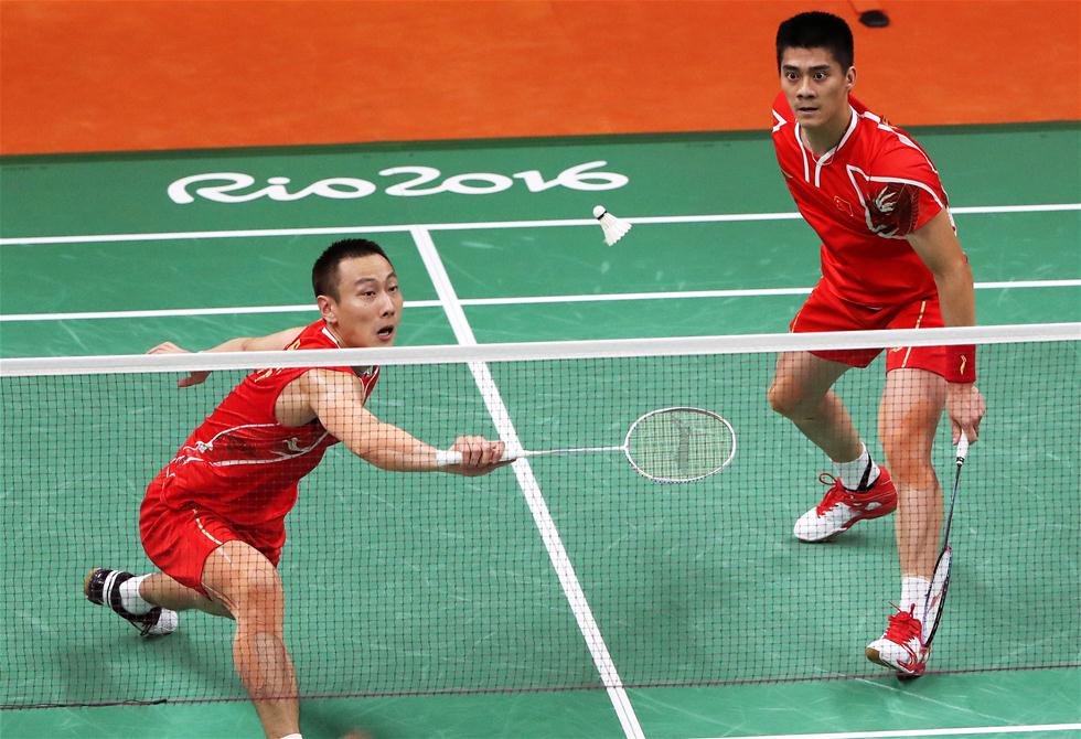 新华社照片,里约热内卢,2016年8月12日 (里约奥运会)(1)羽毛球——男双小组赛:傅海峰/张楠获胜8月12日,傅海峰/张楠(左)在比赛中。当日,在2016年里约奥运会羽毛球比赛男双小组赛中,中国选手傅海峰/张楠以2比0战胜德国选手麦克·福克斯/约翰尼斯·斯科特勒。