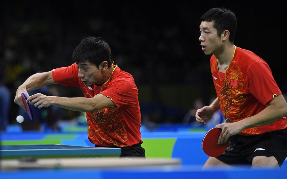 8月12日,中国队选手张继科(左)/许昕在比赛中。 当日,在2016年里约奥运会乒乓球男子团体小组赛中,中国队以3比0战胜尼日利亚队。