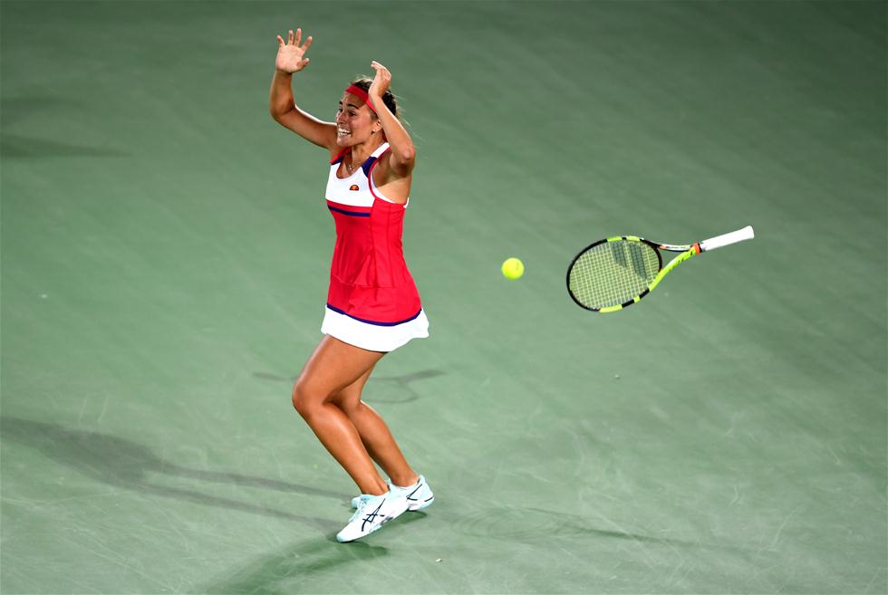 8月13日,普奇庆祝胜利。 当日,在2016年里约奥运会网球女子单打决赛中,波多黎各选手普奇以2比1战胜德国选手科贝尔,夺得冠军。