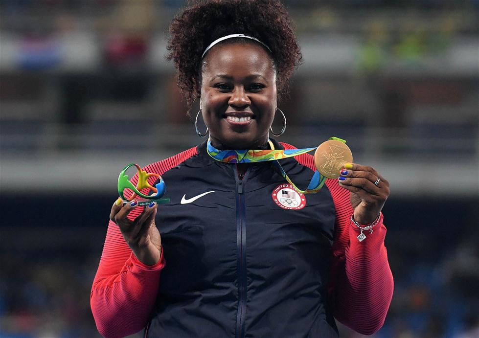 8月13日,卡特在颁奖仪式上展示金牌。 在12日进行的2016年里约奥运会田径女子铅球决赛中,美国选手卡特以20米63的成绩夺得金牌。