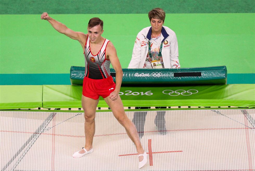 8月13日,白俄罗斯选手汉查罗(前)在比赛后庆祝胜利。 当日,在2016年里约奥运会男子蹦床比赛中,白俄罗斯选手汉查罗夺得冠军。