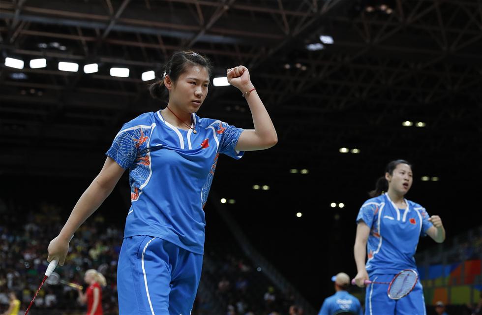 8月13日,骆赢(左)/骆羽在比赛中庆祝。当日,在2016里约奥运会羽毛球女子双打小组赛中,中国选手骆赢/骆羽以2比0战胜美国选手李意恒/奥巴娜娜。