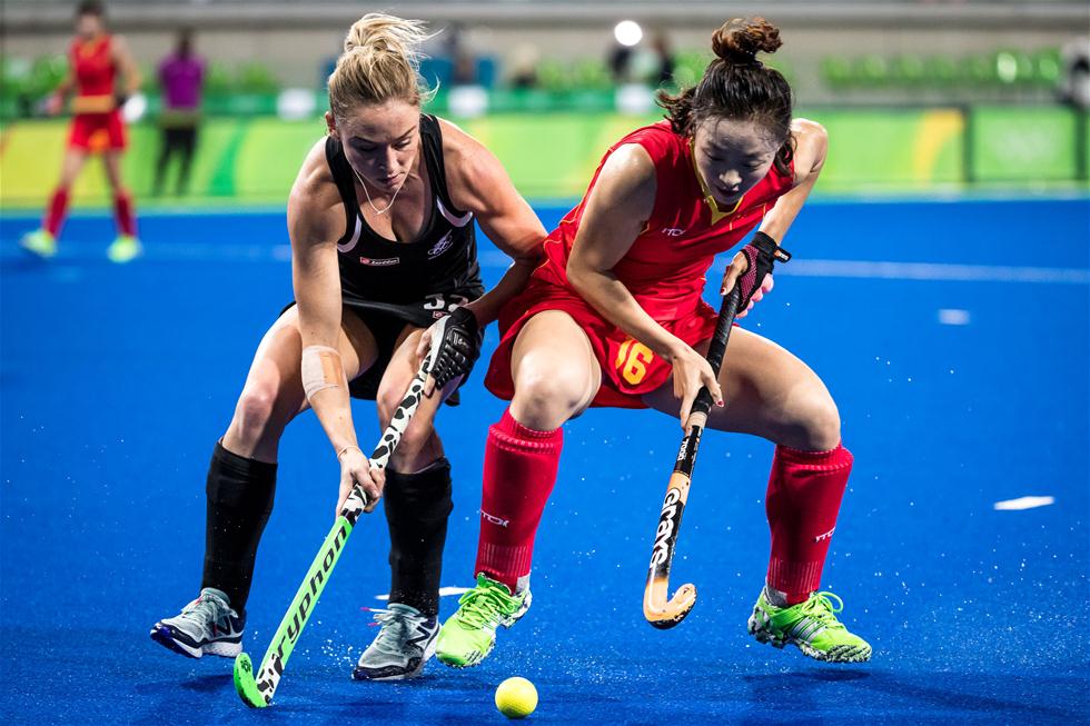8月13日,中国队球员欧紫霞(右)在比赛中拼抢。 当日,在2016年里约奥运会女子曲棍球小组赛中,中国队以0比3不敌新西兰队。
