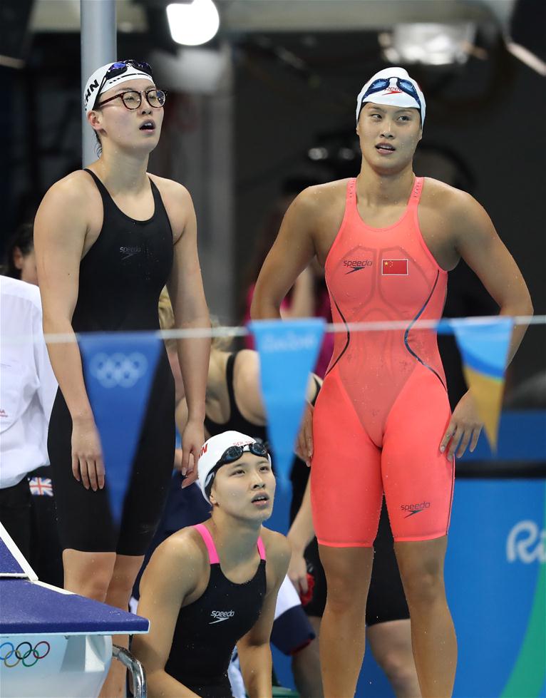 8月13日,中国队选手傅园慧、朱梦惠、陆滢(由左至右)赛后查看成绩。当日,在2016年里约奥运会游泳女子4x100米接力赛中,中国队以3分55秒18的成绩获得第四名。