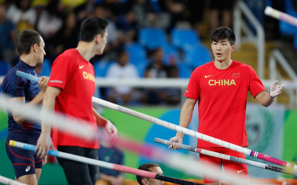 8月13日,中国选手黄博凯(右)在资格赛中与队友姚捷交流。当日,在2016年里约奥运会田径男子撑杆跳高资格赛中,中国选手姚捷与黄博凯分获第14和并列第16名的成绩,无缘决赛。