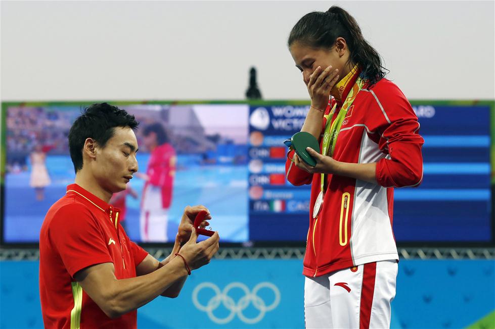 8月14日,中国跳水队队员秦凯(左)在颁奖仪式后向何姿求婚。当日,在2016年里约奥运会跳水女子3米板决赛中,中国选手何姿以387.90分获得亚军。在颁奖仪式后,赛场出现感人一幕,中国跳水队队员秦凯向何姿求婚并成功。