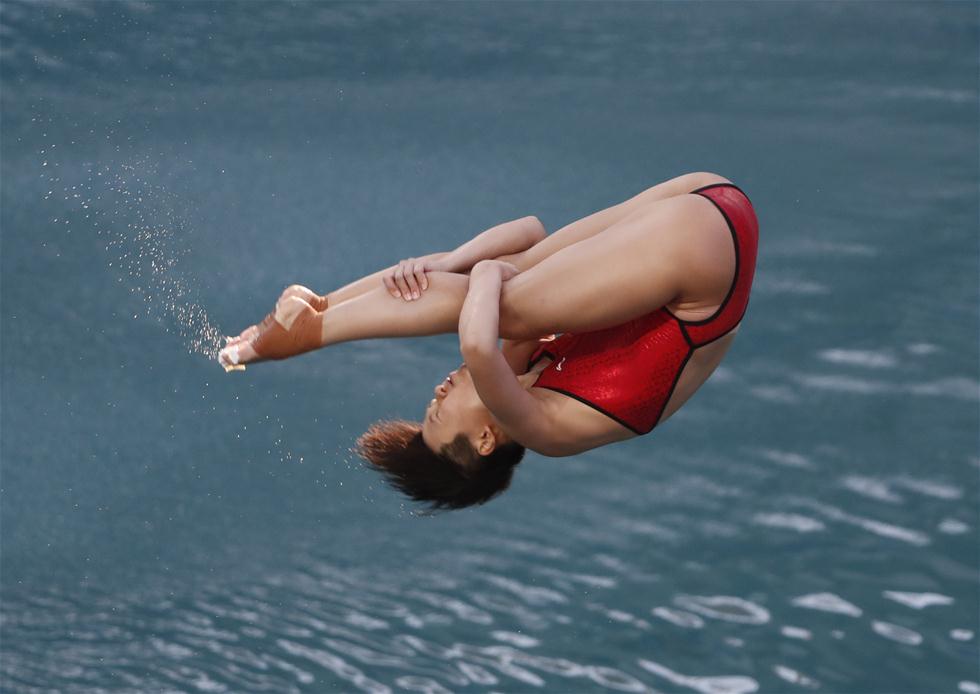 8月14日,中国选手施廷懋在比赛中。当日,在2016年里约奥运会跳水女子三米板决赛中,中国选手施廷懋夺冠。