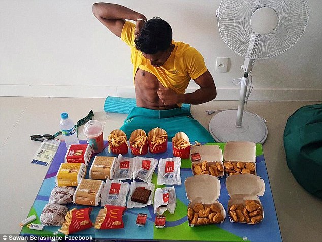 里约奥运吃货现形了!为了安慰自己受伤的小心脏,澳大利亚羽毛球男双选手塞拉赛格(Sawan Serasinghe)在被淘汰后,决定用填充胃部的方式“一饱解千愁”。他准备了一顿麦当劳盛宴,总热量高达8369卡路里!
