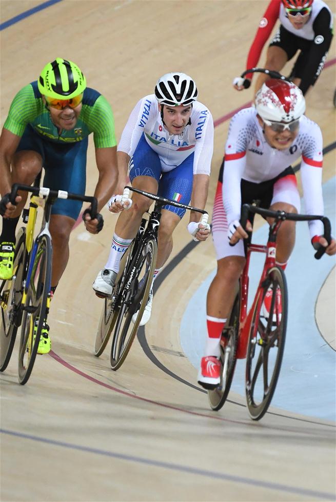 8月15日,意大利选手维维亚尼(左二)在比赛中。 当日,在2016年里约奥运会场地自行车男子全能赛中,意大利选手维维亚尼夺得金牌。